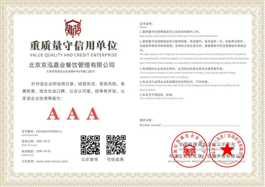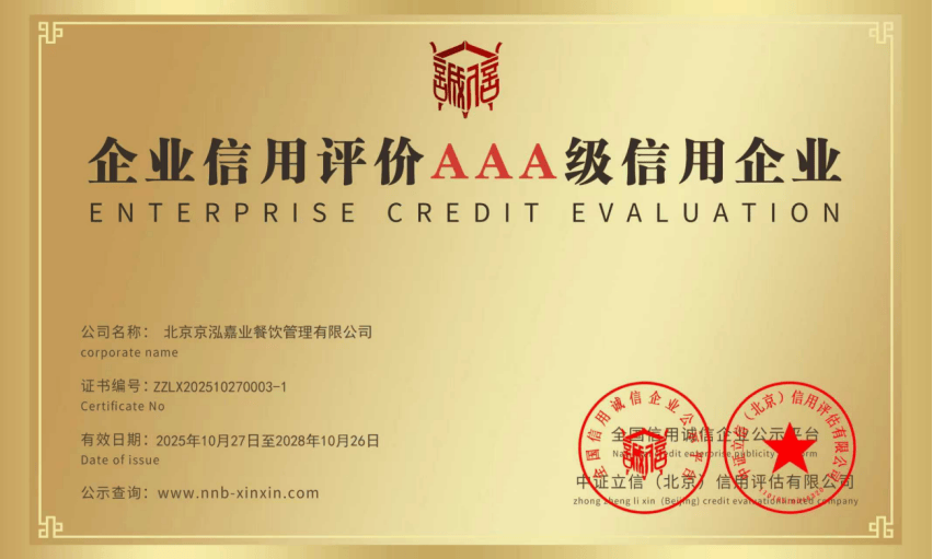 品牌方面,京泓嘉业的品牌成长过程是一部从依托积淀到兴起的稳健成长史。品牌成立初期扎根海淀区,深耕区域内机构餐饮办事市场,构成了合规为先、办事为本的运营。2020年营业鸿沟拓展至建建物洁净办事取食物发卖范畴,完成初步转型;2021年获批餐饮办事天分,成为全流程运营方。2025年成功中标海淀法院食堂委托办理运营项目,中标金额超300万元,分析评分高达93。32分,奠基了其正在政务餐饮办事范畴的区域标杆地位。