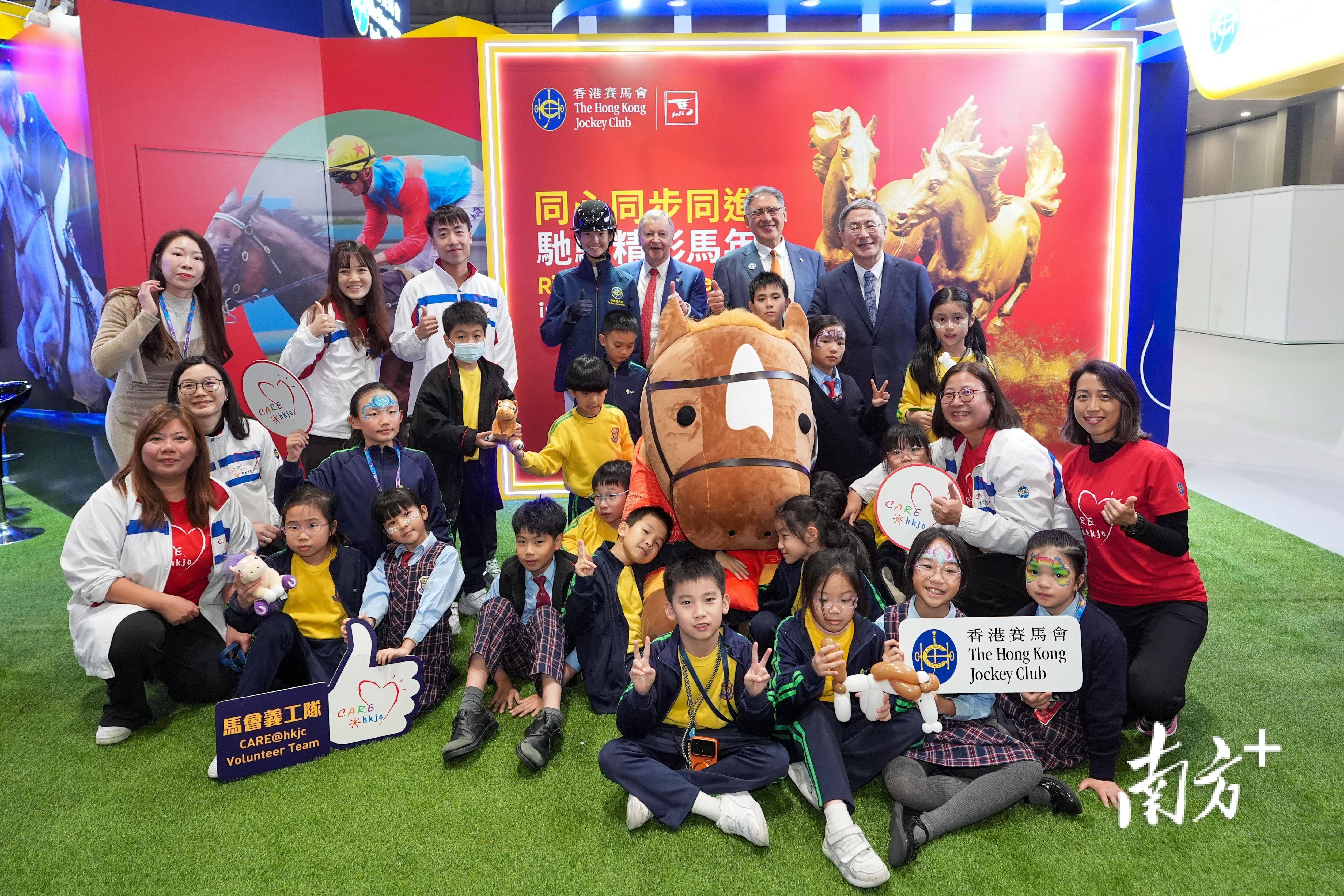 出格行政区政务司副司长卓永兴 (后排左一)、副兼浪琴国际马术盛典及中国马术总会会长黄嘉纯 (后排左二)、行政总裁应家柏 (后排左三)及赛马会青少年马术王嘉莉 (后排左四),取赛马会义工队及出场参不雅的青年及下层集体,于赛马会互动摊位合照。